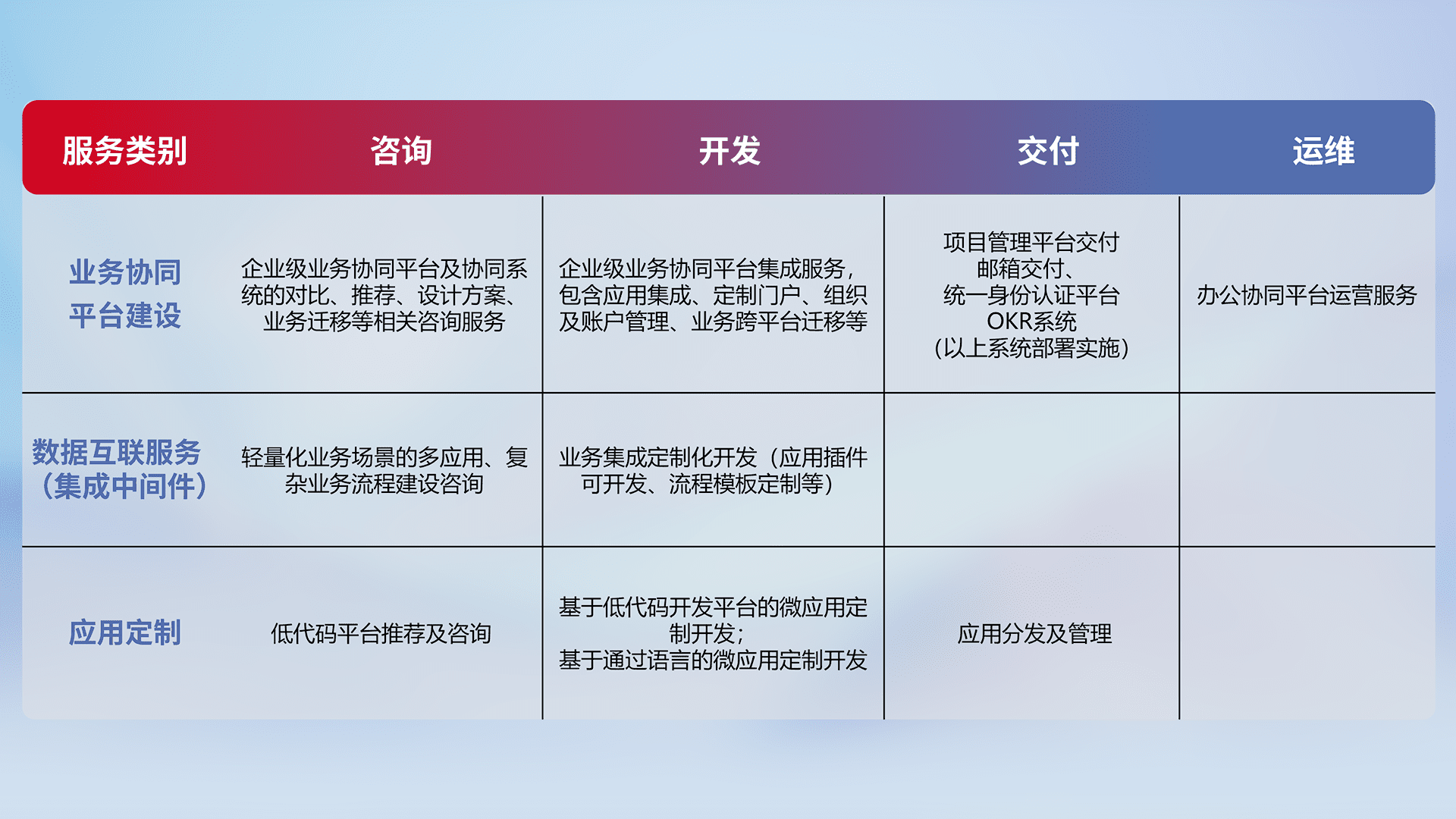 针对钉钉、、企微、、、IDaas等平台级产品提供产品的规划、、、方案、、交付、、定制化开发等服务,,实现如统一协同办公、、智能客户服务、、、、混合会议管理、、智能数据查询、、等业务场景,,实现数字化转型。。